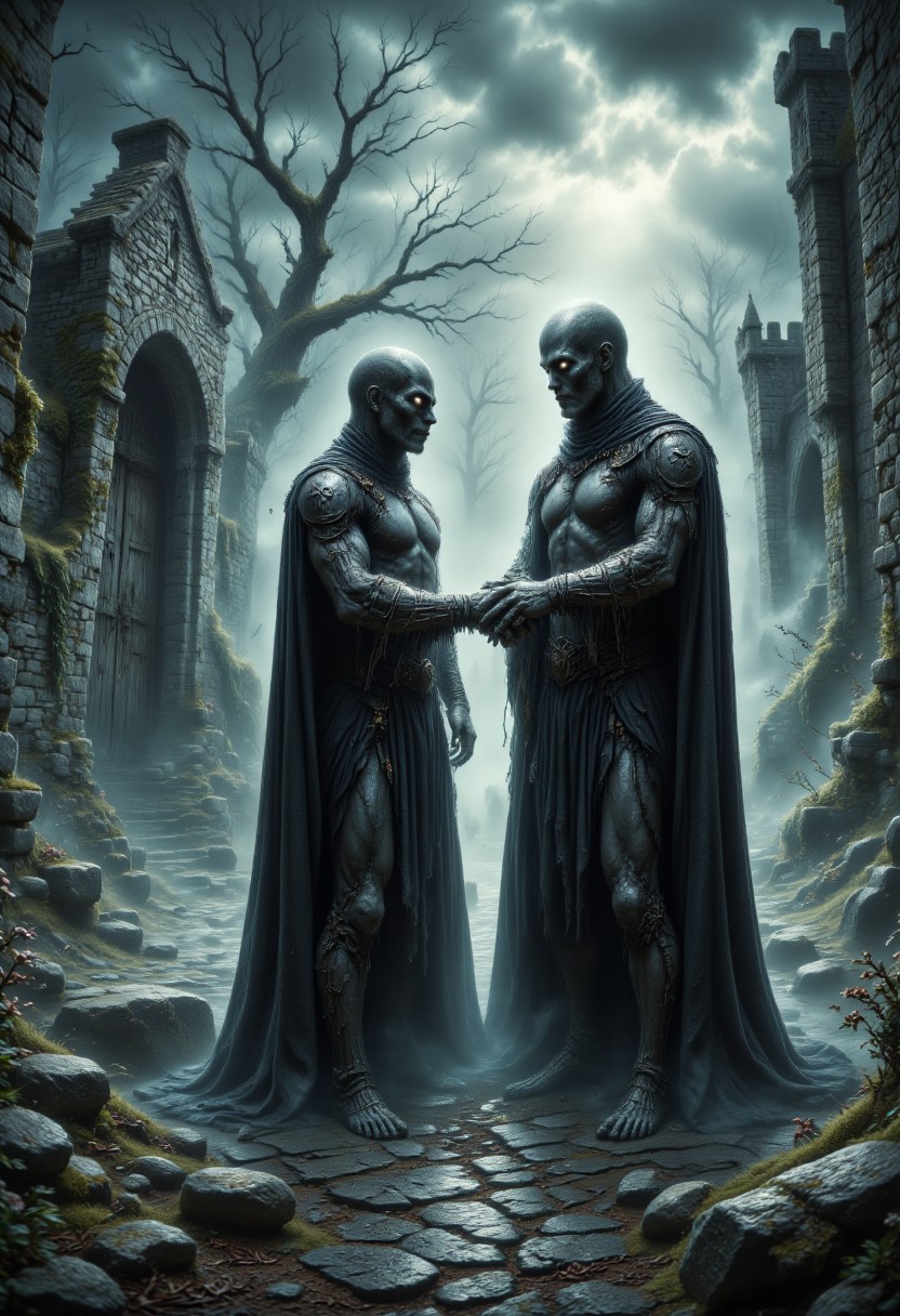 A hero in shining armor facing off against a shadowy figure wielding a massive, cursed weapon, with the fate of the world at stake. , pinkgloomydoomy, aidmaHalloweenBoost, aidmafluxpro1.1