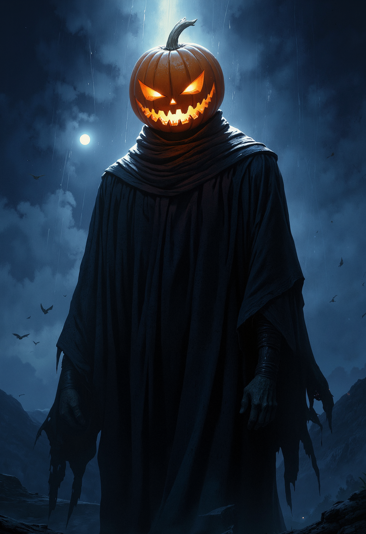 A tall, shadowy figure with a glowing pumpkin for a head. The pumpkin has an eerie, jagged grin with glowing orange light emanating from its eyes and mouth. The figure is dressed in a flowing dark cloak, the fabric obscuring the body entirely. The scene is set at night, with a small, bright moon in the distance casting pale light. Rays of light shine through the top of the pumpkin, enhancing its glow. The figure is slightly turned, showing only the upper body from a low-angle perspective. The atmosphere is dark and mysterious, with a deep blue night sky and some faint clouds drifting by. <lora:FluxMythP0rtr4itStyle:0.8> MythP0rt, <lora:aidmaMJ6.1-FLUX-V0.2:0.6> aidmaMJ6.1, <lora:sxz-Dark-Fantasy-v2-Flux:0.66> drkfnts style,