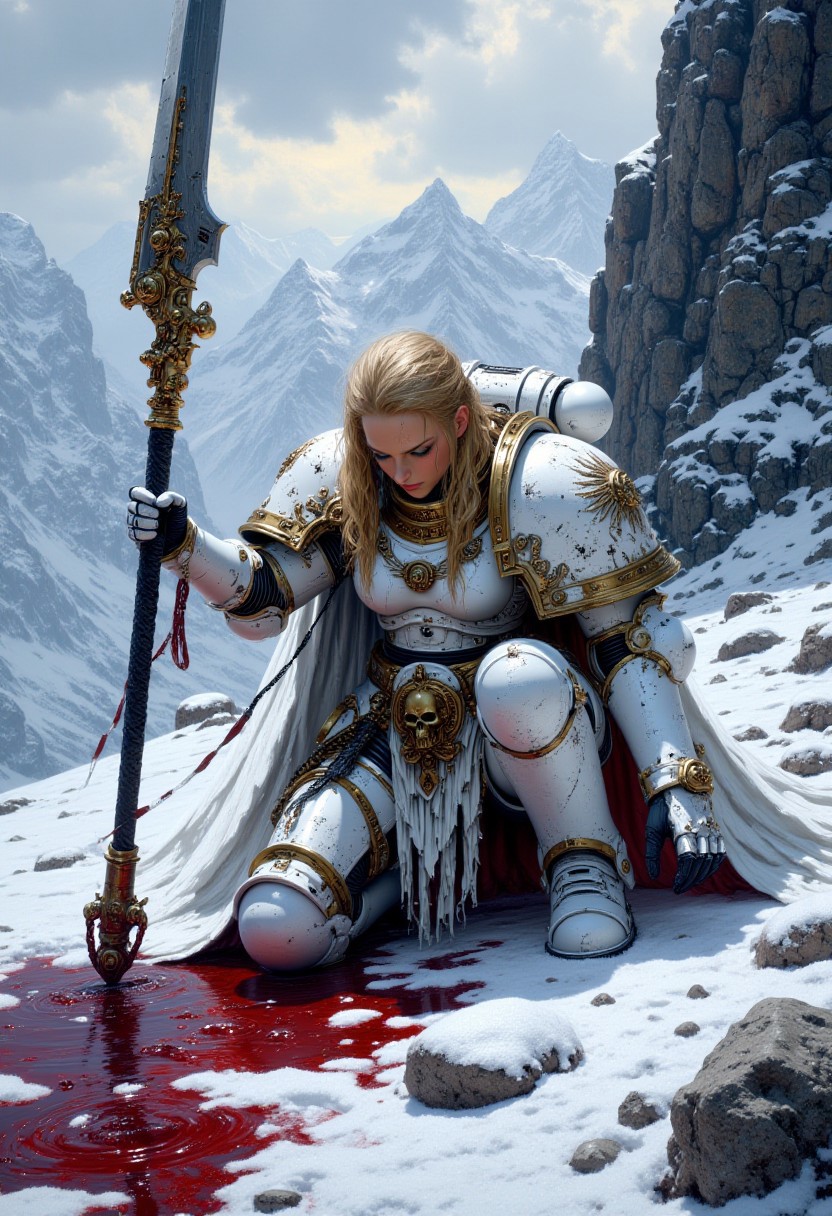 An atmospheric and powerful dark fantasy image, classical style painting of a beautiful female WhiteS40K dressed in intricate white power armor. She crouches with her head down and her dirty blonde hair falls over her face. She holds a powerful staff of dark steel. There is blood in the snow around her from a fallen enemy. Cinematic shot in a snowy mountainous region.