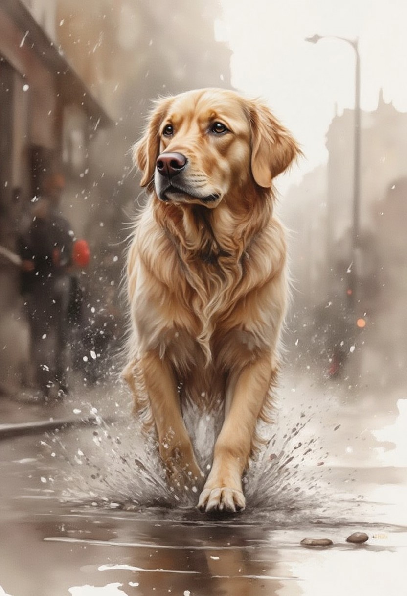 watercolor, wet on wet, paintstreaks, watercolor painting, a golden retriever in the rain a painting in the style of Eugen Chisnicean