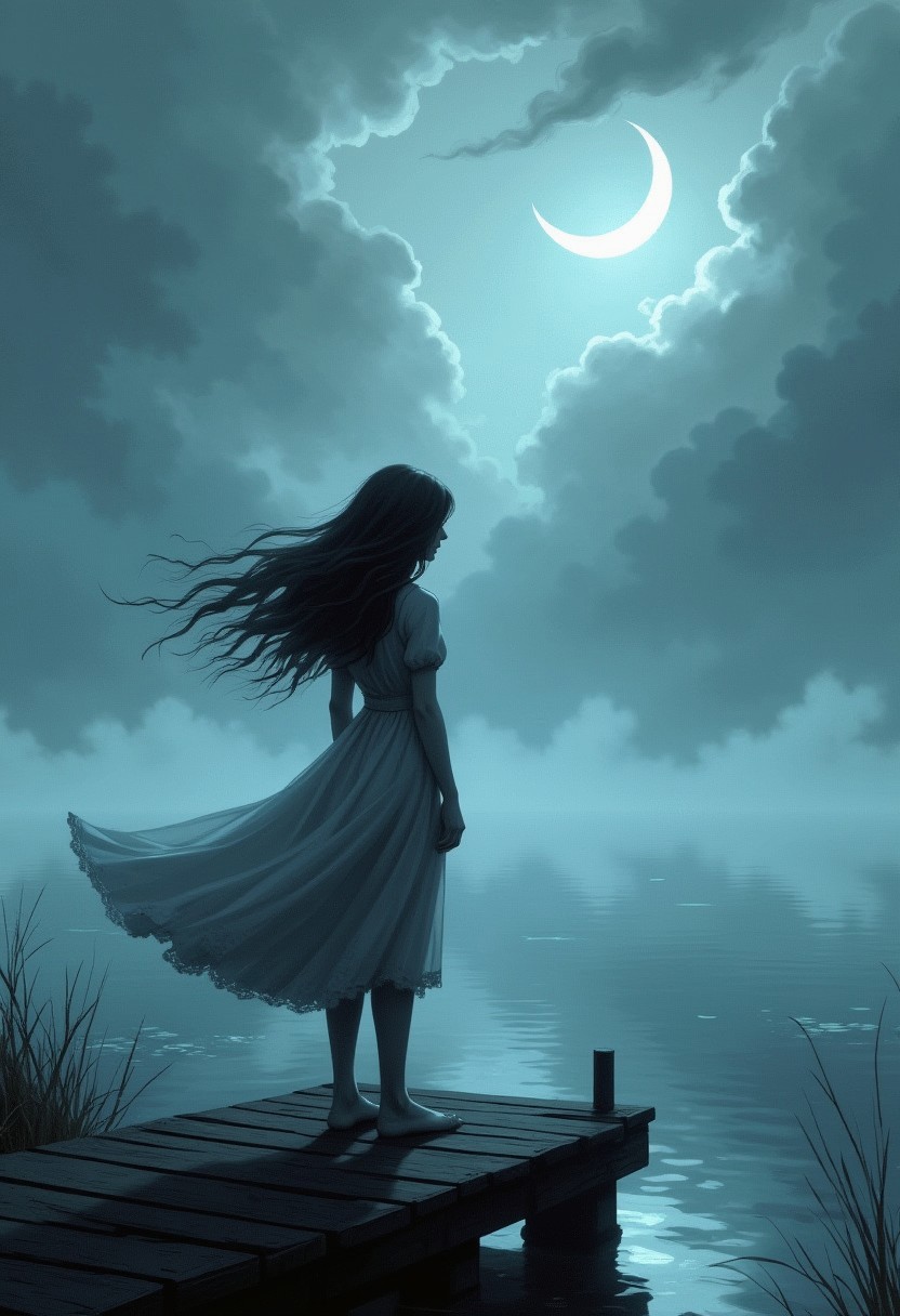 illustration young girl standing on a foggy dock, with a black, bottomless lake behind her. Her long, flowing hair is blown by an unseen wind, and her dress seems to fade into the mist. The sky is filled with heavy gray clouds, and the pale light from a crescent moon barely breaks through. The fog swirls in unnatural patterns, and the girl’s shadow seems too long, as if something is lurking behind her. The lighting is cold and spectral, with muted blues and silvers dominating the palette