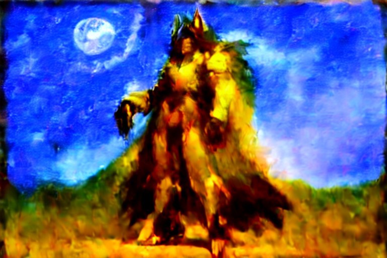 close-up portrait, moonlight, moon rays, a clothed male wolf with long blue hair, fluffy tail, digitigrade feet, standing, swampy, looking at another, cityscape, Alphonse Mucha