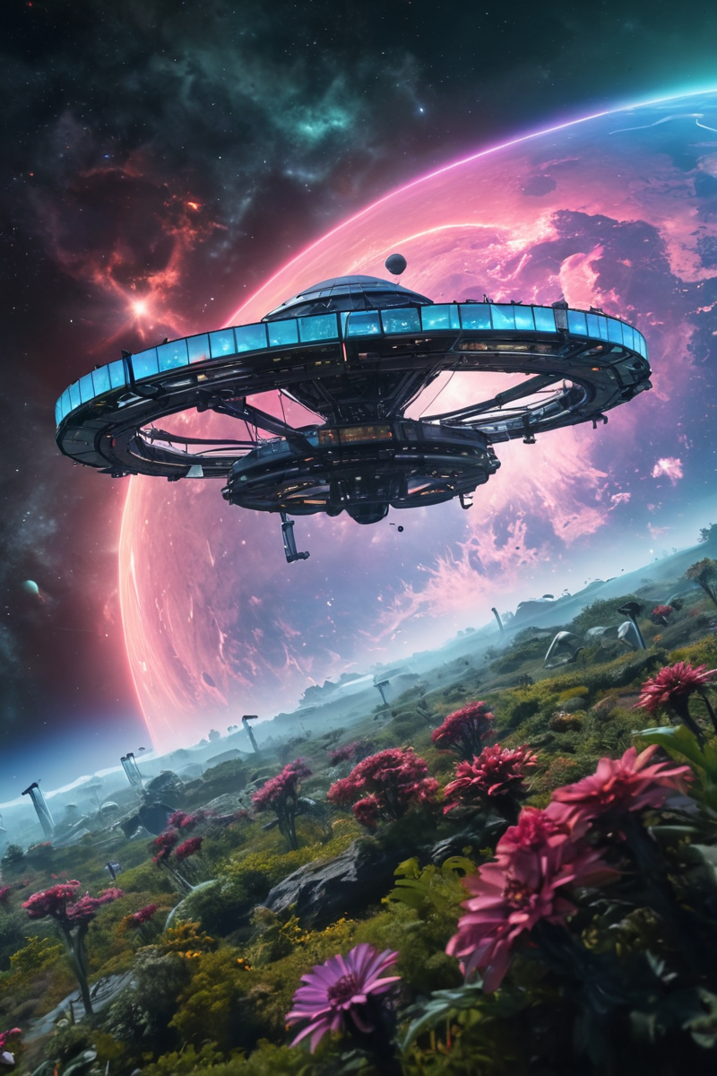 A futuristic space station orbiting a distant, colorful nebula. The station's design is sleek and advanced, with transparent domes housing lush gardens and alien flora. Spacecraft of various shapes and sizes are docked around the station, and a massive ring of solar panels captures the energy of nearby stars. 8K