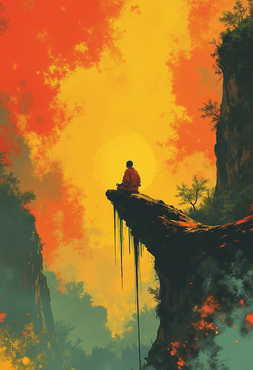 Dunhuang Art, minimalism illustration, mural art, an extremely tiny monk sitting on the giant hand of Guanyin an extremely tiny monk sitting on the giant hand of Guanyin, perfectly interwoven curves, chinese ink style, chinese freehand style, frosted texture, gold red indigo color scheme, dunhuang mogao grottoes color scheme, ripples of color diffusing, printmaking style, layered curves, rich color, made of transparent frosted glass, simple background, bright environmental lighting, warm and shining tone, capillary phenomenon, diffraction, total internal reflection