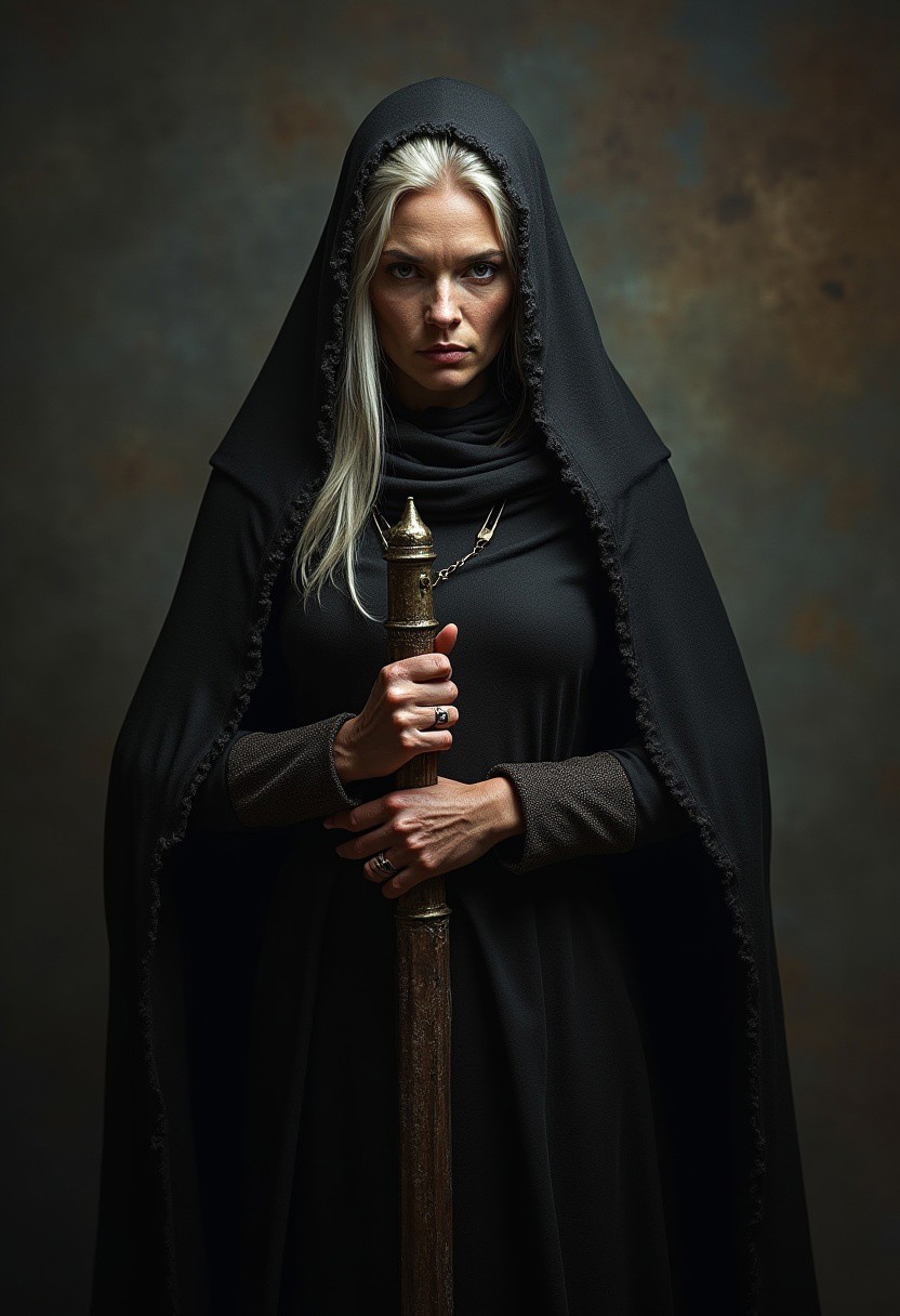 Ultra realistic Portrait of a wicked 80yo female medieval warlock.