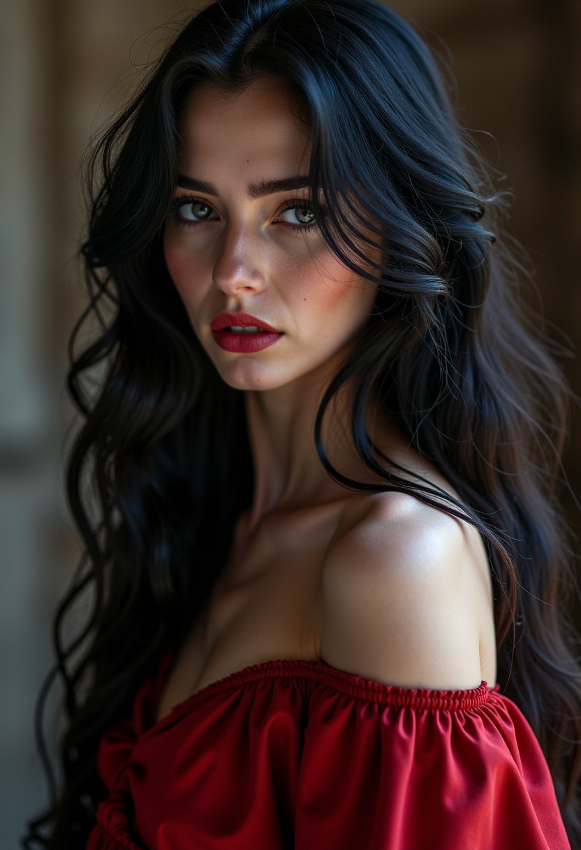 A close up portrait, detailed skin. A shadowy depths of an ancient castle, a figure of unearthly beauty stirs. Born of moonlight and mystery, she is the epitome of desire and danger, a vampire queen unlike any other. Her skin is as luminescent as polished alabaster, contrasting starkly with the flowing midnight tresses that cascade down her back like a river of darkness. Her eyes, deep pools of obsidian, hold the secrets of centuries within their enigmatic depths, drawing all who gaze upon them into her seductive thrall. Her form is a mesmerizing study in contrasts; delicate curves wrapped in lean, lithe muscles that hint at a strength beyond mortal comprehension. A gown of crimson silk clings to her body, accentuating every subtle movement with a whisper of fabric against flesh. As she moves, a graceful phantom amidst the swirling shadows, it is impossible not to be captivated by her ethereal beauty. Each step is a balletic dance of death, both haunting and alluring in its fluidity. An aura of dark power and sensuality surrounds her, a tantalizing blend of danger and desire that draws both mortals. Yet it is not merely her physical allure that enthralls; there is an intelligence in those ancient eyes, a wisdom and understanding born of countless lifetimes. She is a being of endless contradictions, both predator and protector, monster and muse. She is the vampire queen, a creature of myth and legend, of whispered tales told in hushed tones around flickering fires.