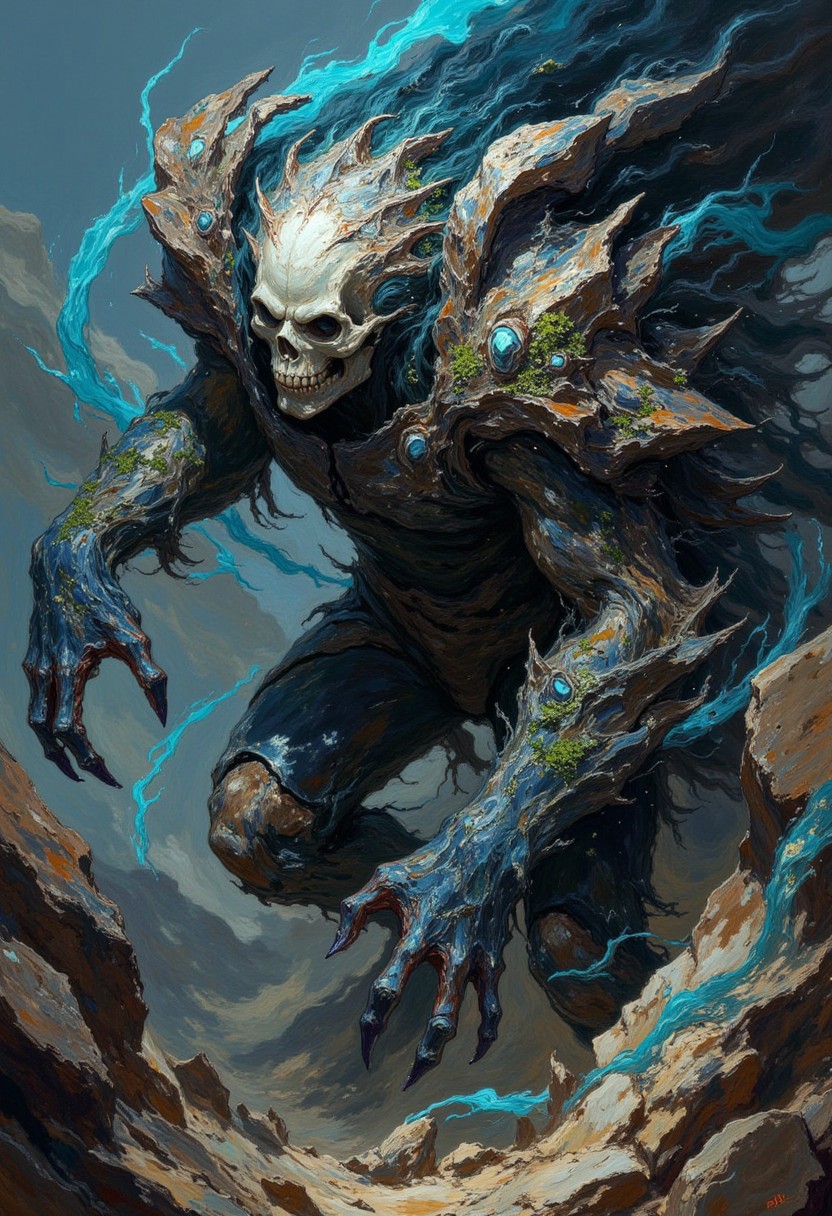 detailed photorealistic image, closeup portrait of (evil (undead) (stone being:0.7), (golem:0.9), corrupted, hovering stones and dirt forming the rough shape of a (human:0.7), (hair:0.2), corrupted grey (skin:0.7) made of dirty-stone, (lichen:0.4), horror, (stone ((geode)) skull:0.4), (obsidian:0.3), flowing with (grey:0.3) magic, magical lichen, swirling transparent dark blue magic, stone skeleton, dramatic angle, (extreme angle shot), epic fantasy, (hands:0.7) and (legs:0.7) made of rocks, (head:0.4) made of geode, close-up, (oil painting), in (ukiyo-e style:0.8), (by Edgar Degas:1.1), (by Pierre-Auguste Renoir:0.7), (by Claude Monet), (by Vincent Van Gough:1.2), directional lighting, masterpiece, perfect composition,