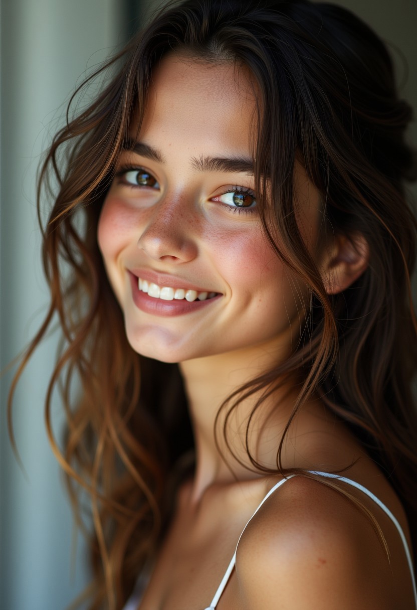 A stunning teenage girl with flawless model-like facial features, flawless light pale skin, and large captivating eyes, cinematic lighting, photoshoot, smirking, shallow depth of field, bokeh, barefoot