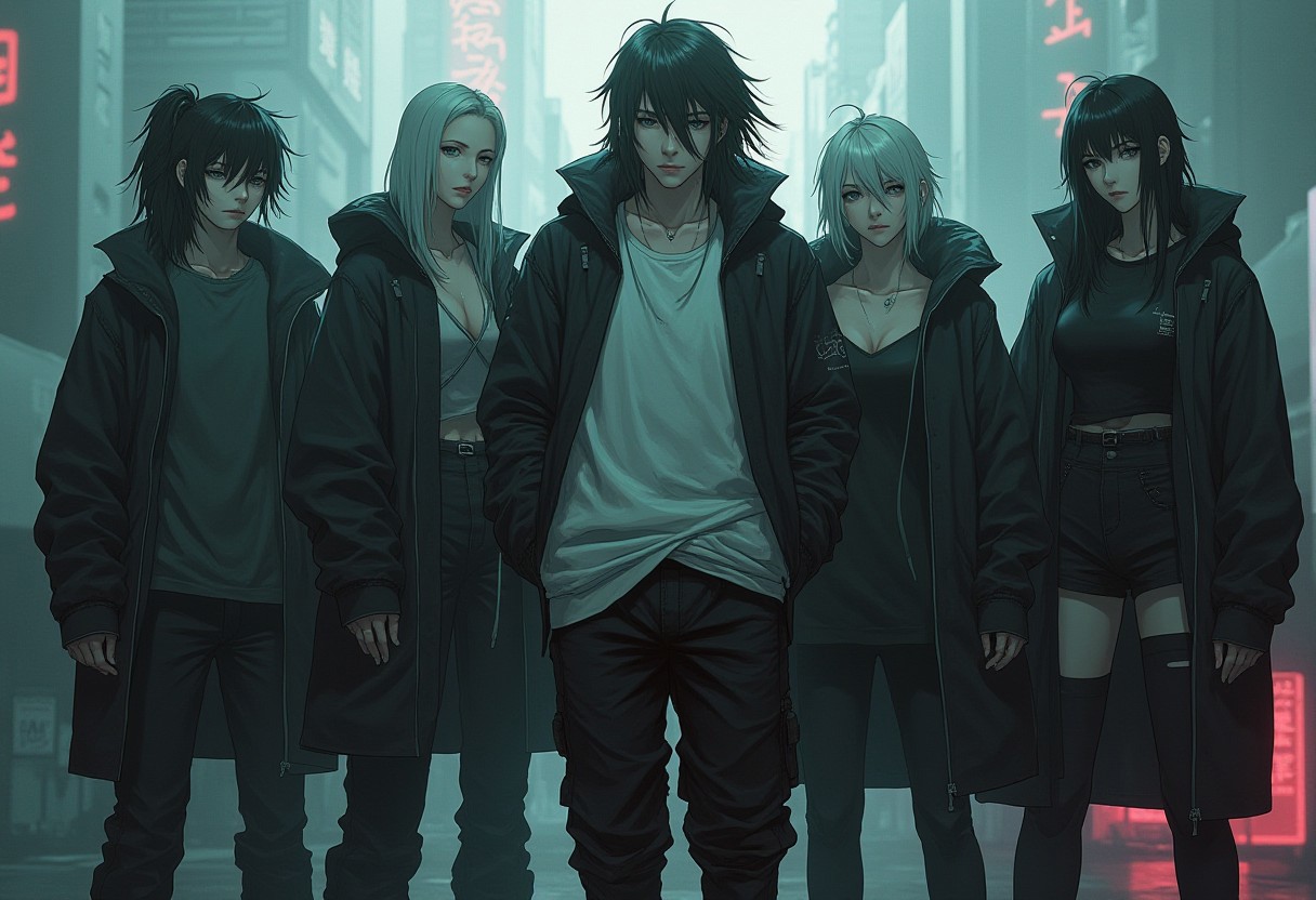 anime, niji, anime source, paint style of James C. Christensen, Ethereal minimalist , dystopian cyberpunk future, (group picture, street muscular female gang showing of their captured victim, posing gangsters:1.3), (captive kidnapped boy, emo boy, bound, restrained), exaggerated, skinny, dutch angle, lonely boy, baggy outfit, , intricate, sharp_focus, concept_art, background zentangle fog,