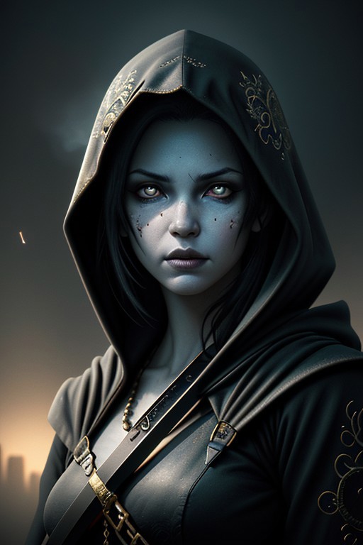 (in Krenz Cushart style:1.2), high-quality, masterpiece, A ghostly assassin, her face shadowed by a dark hood, only her glowing eyes and part of her sharp jawline visible, The camera catches her as she narrows her eyes in concentration, a dagger gleaming just outside the frame, Smoke trails from the blade, the chaotic city lights flicker in the background blending into a blur, Her breath is barely visible as it fades into the mist, high contrast, shadowy lighting, tight close-up, cinematic atmosphere, (elaborate fine details:1.1), (elaborately detailed attire with extraordinary elements:1.1), (hyperdetailed:1.1), (intricate details:1.0), (Refined details:1.1), (best quality:1.1), (high resolution:1.2)