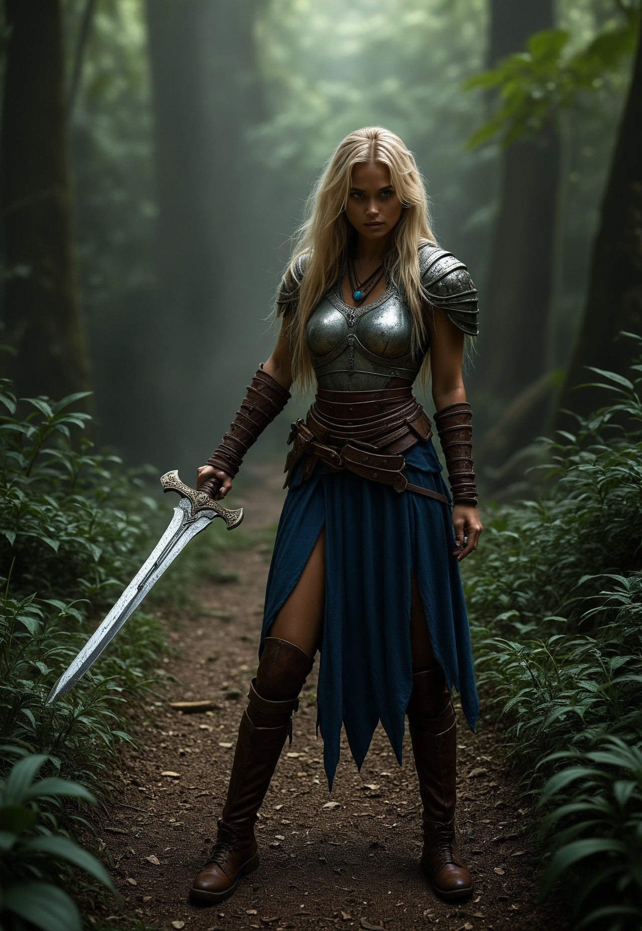 safe_pos, score_9, score_8_up, score_7_up, score_6_up, rating_safe, adult woman, amazonian warrior, blue eyes, very long blonde hair, long hair, muscular female, curvy, ((full clothed tribal armor)), gloves, battle stance, holding weapon, knife, jungle, night, outdoors, solo, dramatic lighting, fantasy, detailed realistic photo <lora:FrankChoStyleV1:0.8>, BREAK score_9, score_8_up, score_7_up, score_6_up, score_5_up, score_4_up (european beauty girl) (8k uhd:1,4) <lora:add-detail-xl:1> <lora:Dynamic Poses:1>