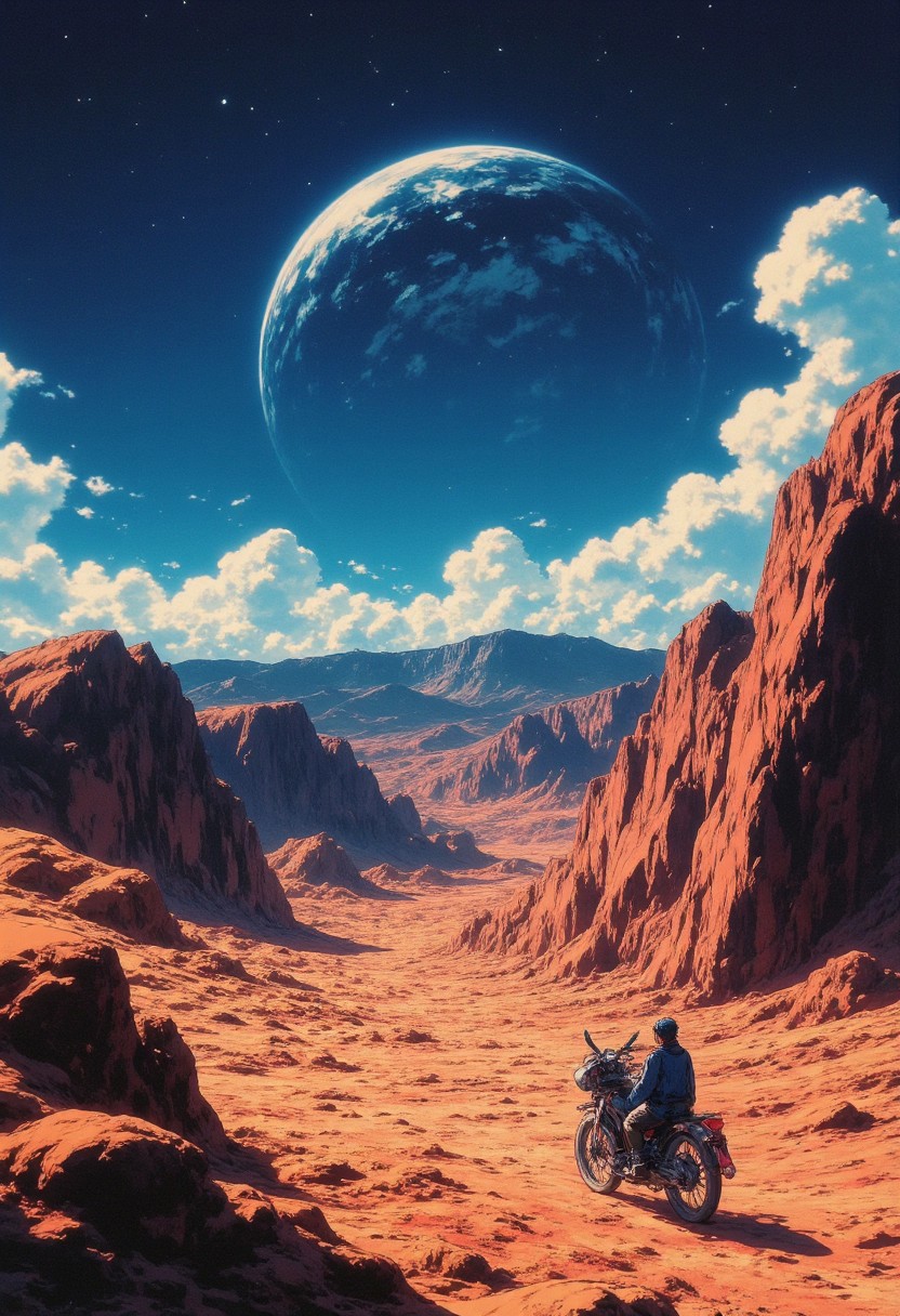 The image is a digital illustration in a detailed, vibrant, high contrast, semi-realistic art style with 90s retro futuristic anime elements without noise or comic halftone effect. The planet Eyjensul, you are here. A frozen tundra for much of its 250 year orbit around Elias. In the decades closest to the supergiant the planet transforms into a desert. As water is drawn from the sands the planet experiences its only weather. Vast storms surge into existence. And the shifting sands reveal their treasure. You are part of the Salvage Union, the backbone of the abandoned world's sputtering economy. When the tundra begins to stir for a few brief months between frost and storm you will seek your fortune on the long road to Perihelion, the last true city and the only shelter. The compostition and the poses are dynamic. The composition is dominated by cool tones, with a muted, slightly gritty texture that enhances the gritty, futuristic atmosphere. ne0nfant4sy
