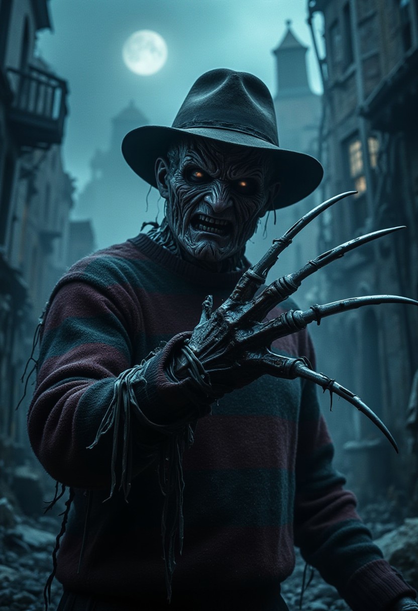 horror show, monster, nightmare, fear, Cinematic style, Beauty, "Freddy Krueger stalking his victim through a fog-filled dream world, his charred face and jagged, scarred skin vividly portrayed. The long, metallic claws on his glove reflect in the moonlight as he moves silently through an otherworldly landscape of distorted buildings and crumbling streets. His signature fedora and sweater are worn and grimy, adding to the terrifying realism of the scene. A terrifying, suspense-filled atmosphere with dark, moody lighting."