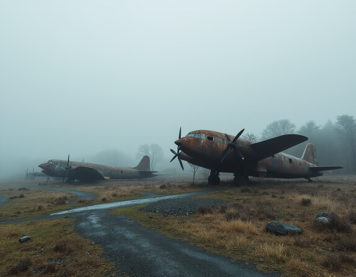 A surreal landscape photo of an abandoned airport on a remote island, where rusted aircraft become twisted metal sculptures that seem to stretch on forever, surrounded by fog that haunts the soul. <lora:Phlux:0.4> <lora:fluxenhancer:0.4> <lora:amateurphoto-v5-14-15-1-1:0.4>