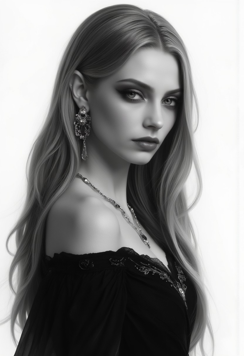highly detailed, grayscale digital drawing of one elf woman head turned right looking at viewer, sultry expression, long light ginger hair, piercing eyes, seductive, charming woman, charmful looking, captivating, minimalist, slender frame, black wedding dress, detailed, vantablack,