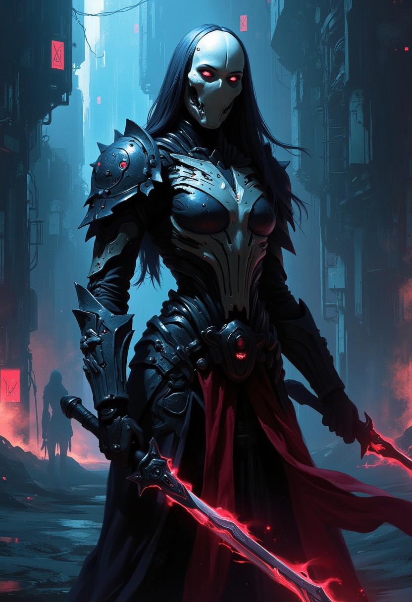 An atmospheric and powerful dark fantasy, natural organic and impressionist classical-style painting of an atlethic girl wearing death themed powered armor with a faceless white visor, blue and red contrast lighting, dynamic viewpoint, dynamic angle, ribcage style cuirass, pauldrons, holding a futuristic sword, ((cyberpunk industrial complex background))