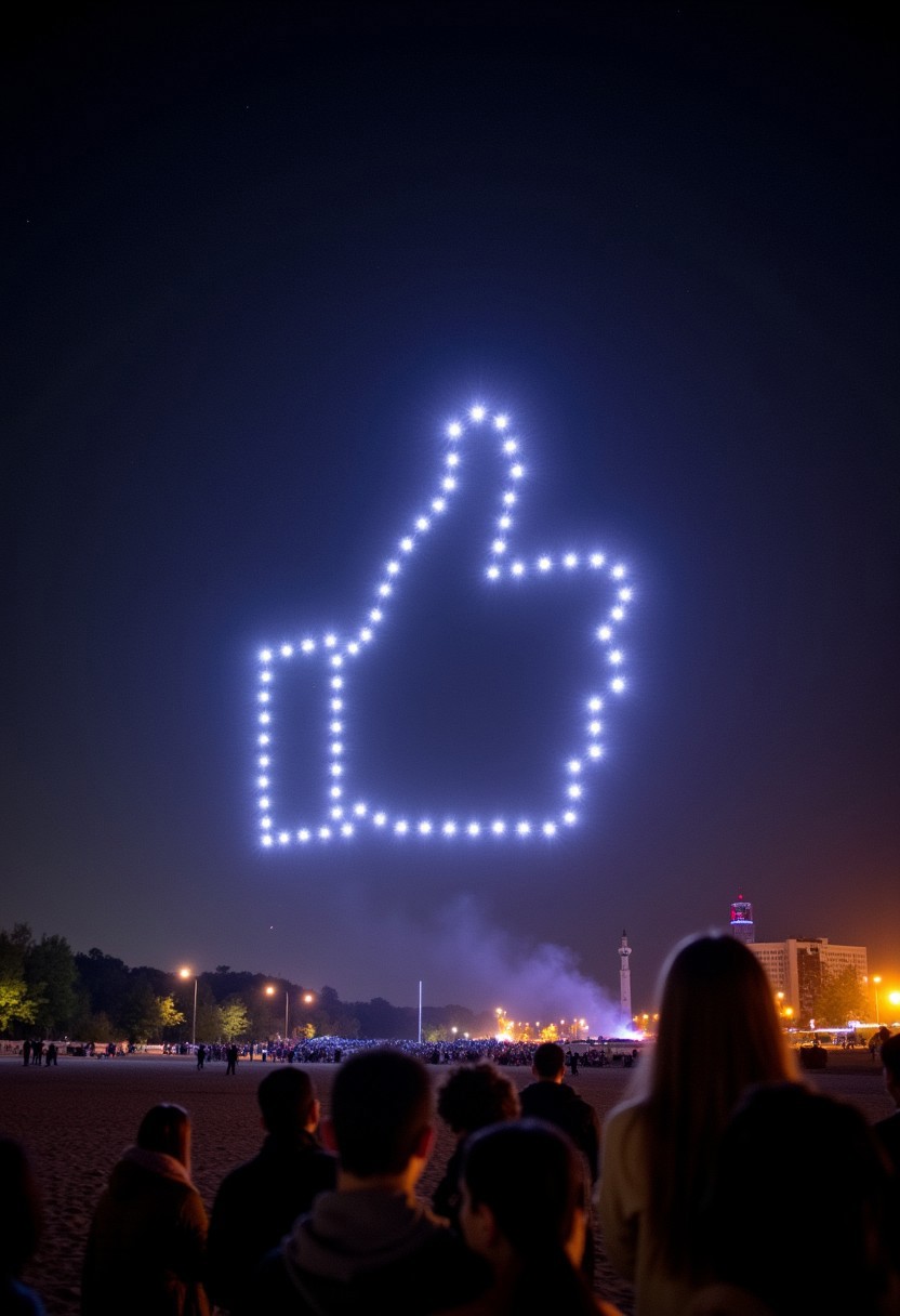 This is a photograph of a night sky featuring a spectacular display of drone lights that are arranged to form a thumbs up symbol in an illuminated, large-scale aerial display with people looking up and watching in awe.