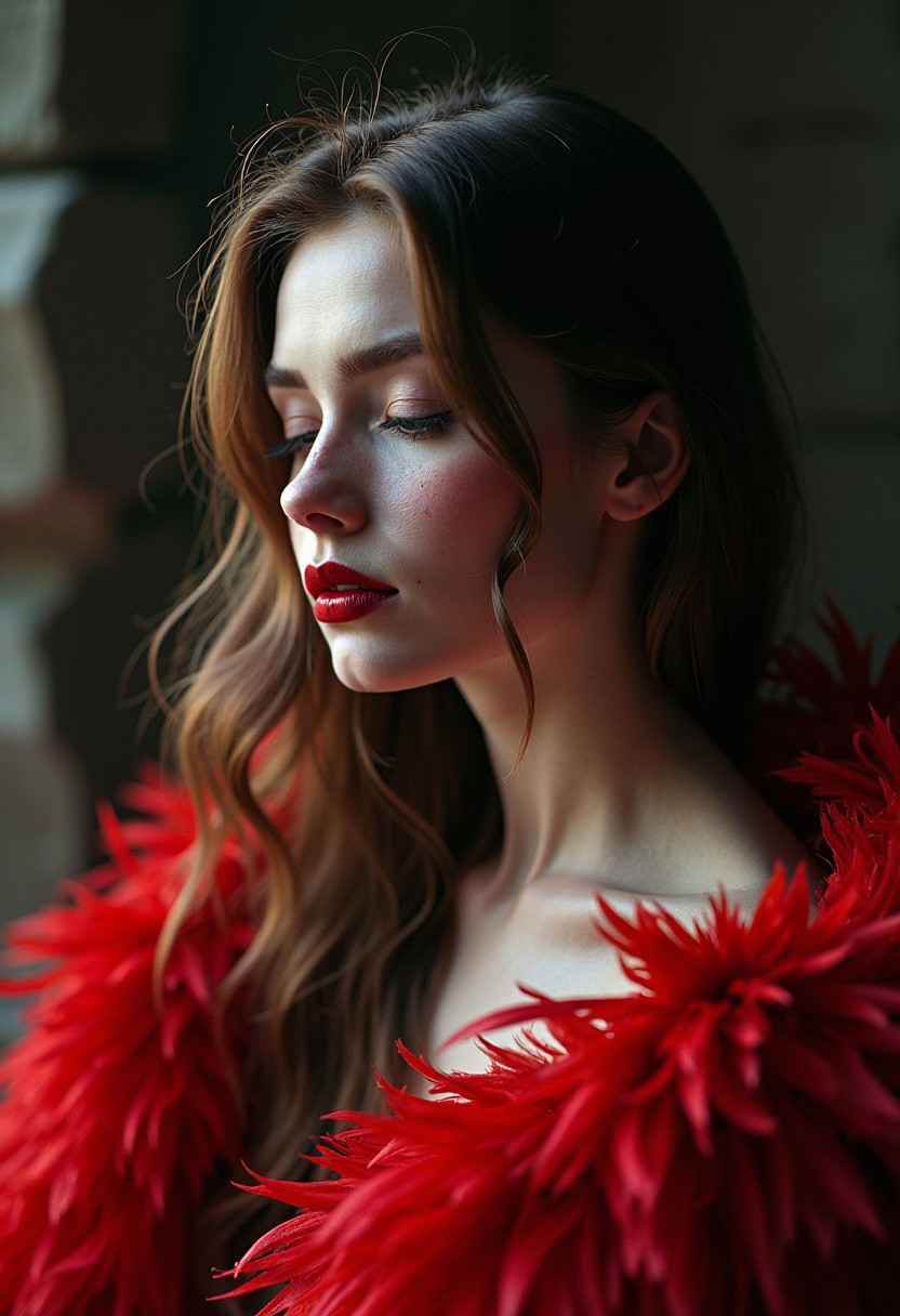 1woman, soft freckles, brown hair, long hair, etched stone, Dichromatic, deep rich colors, highly detail, great light, sharp focus, elaborate, dressed in a haute couture dress detailed with swan feathers, mysterious, sitting, red lips, glossy lips, white eyelashes, an image of 8k ultra realistic anime mix, high detailed, (((masterpiece))) , (((best quality))), Complex background, poppy, Moonlight, Wonder, ethereal magical atmosphere, dynamic, joy,1girl,high fashion,grim, backlight colors,silhouette colors,cosmic frame, black background,portrait,photo, closed eyes, cinematic perfect intricate stunning fine detail, shiny, enhanced quality, highly contrasted, mysterious, red riding hood, dark colored shadow, neon details, low contrast,