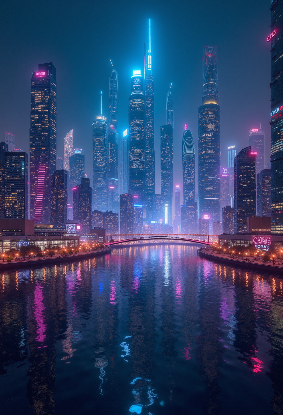 a vibrant and futuristic cityscape bathed in a dazzling array of neon lights. Towering skyscrapers of various shapes and sizes pierce the night sky, their illuminated windows casting a mesmerizing glow on the surrounding urban landscape. The city is reflected in the calm waters below, creating a mesmerizing double image of the bustling metropolis. The overall atmosphere is one of energy and excitement, with the vibrant colors and intricate details of the cityscape capturing the essence of a thriving and technologically advanced metropolis. The scene evokes a sense of wonder and awe, inviting the viewer to imagine the possibilities and experiences that await within this futuristic urban environment.