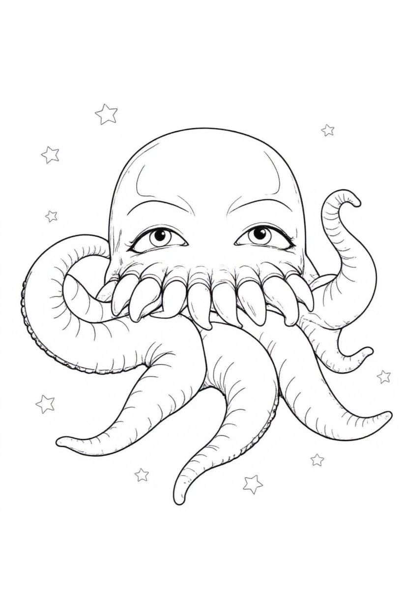 black and white colouring page, 8-tentacled ctopus, laugh emojis