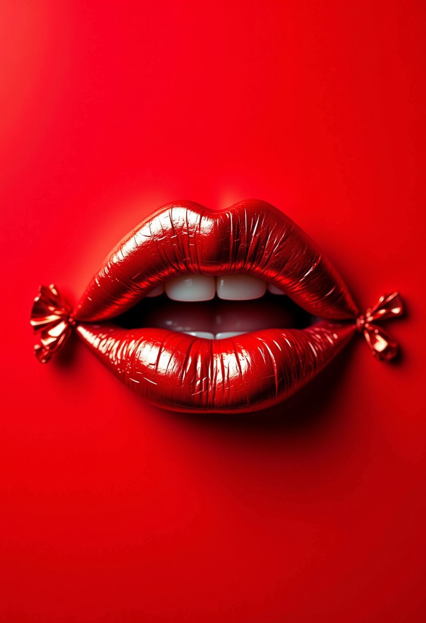 A surreal combination of [aidmafluxpro1.1-style bold | bright red lips | shiny candy wrapper], their textures alternating between the (smooth, glossy surface of the lips) and the (crinkled, metallic sheen of the wrapper). The lips, full and vibrant, seem ready to speak, BREAK while the delicate red foil wrapping surrounds them, creating a surreal contrast between the softness of the lips and the firm structure of the wrapper. The color contrast is striking, with the [glossy red lips | metallic red foil] reflecting the light in different ways, BREAK adding depth and dimension to the image without blending or losing focus on either element. The background is a simple, flat red, BREAK isolating the candy-lip hybrid, amplifying its visual intensity while keeping the focus clear and distinct.