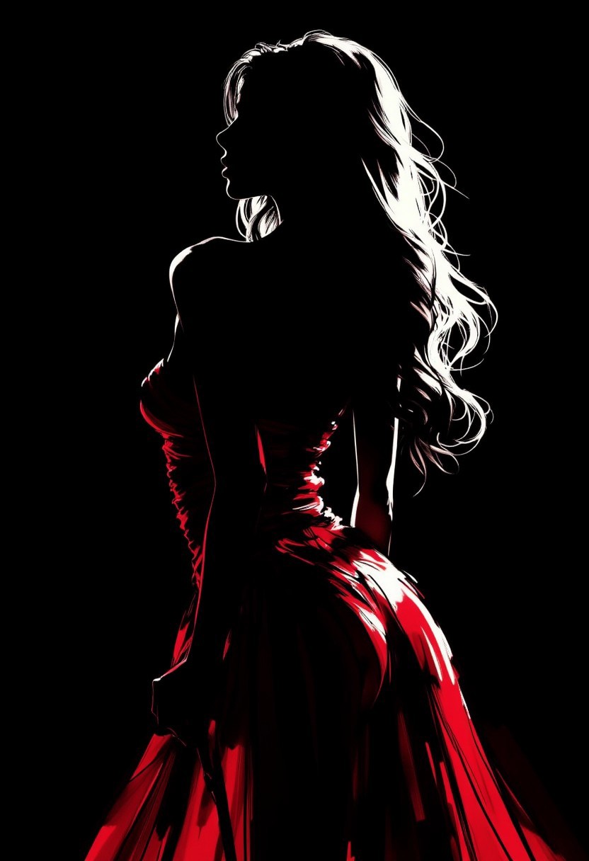 Silhouette Art, magnificent, dark background, portrait of stunning oriental woman, long flowing hair, seductive, sultry, lustful, sexy cocktail dress, light hitting one side of face, inksketch