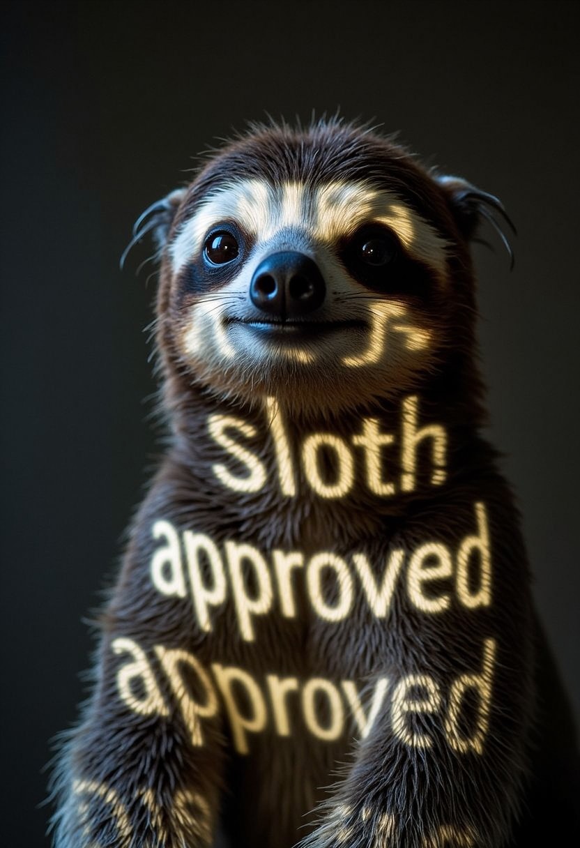 f4c3_p40j3ct10n, a projection of the word "sloth approved" on a cute sloth Face