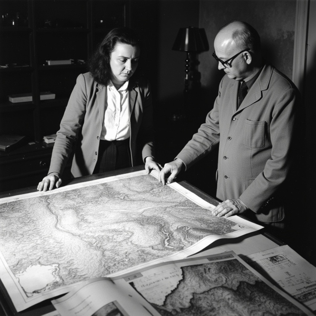 This photograph, likely taken in the 1950s or 1960s, depicts a scene in a cluttered, dimly lit room with a focus on two people engaged in map-making or geological work. The room features a large, detailed topographic map spread out on a table. The map is a complex, intricate drawing with various shades of gray and black, showing a detailed landscape, possibly a city or geological area.