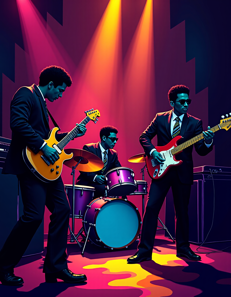 A vibrant and energetic scene showcasing a funk music band performing on a dimly lit stage, The band consists of a gritty guitar player with a yellow axe, a purple bassist slouched over his instrument, a drum section formed by stacked, stylized drums, and a soaring saxophonist wearing a black suit with bold, colorful stripes, The stage is filled with swirling geometric patterns and neon lights, creating a dynamic atmosphere, Use a saturated and sharp color palette with lots of contrast and accentuations, The overall mood should be one of vibrant energy and musicality, capturing the spirit of funk music and its love for bold colors and shapes, , (&:0)