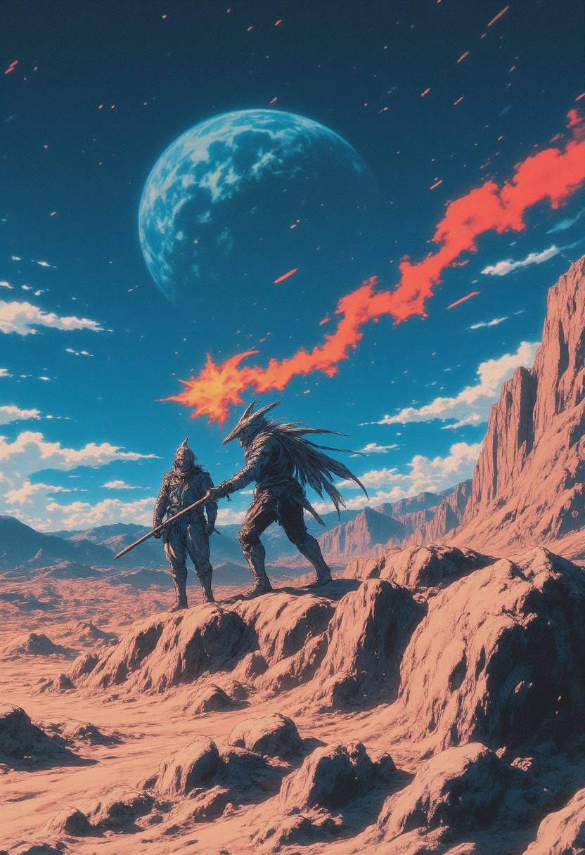 The image is a digital illustration in a detailed, vibrant, high contrast, semi-realistic art style with 90s retro futuristic anime elements without noise or comic halftone effect. The planet Eyjensul, you are here. A frozen tundra for much of its 250 year orbit around Elias. In the decades closest to the supergiant the planet transforms into a desert. As water is drawn from the sands the planet experiences its only weather. Vast storms surge into existence. And the shifting sands reveal their treasure. You are part of the Salvage Union, the backbone of the abandoned world's sputtering economy. When the tundra begins to stir for a few brief months between frost and storm you will seek your fortune on the long road to Perihelion, the last true city and the only shelter. The compostition and the poses are dynamic. The composition is dominated by cool tones, with a muted, slightly gritty texture that enhances the gritty, futuristic atmosphere. ne0nfant4sy