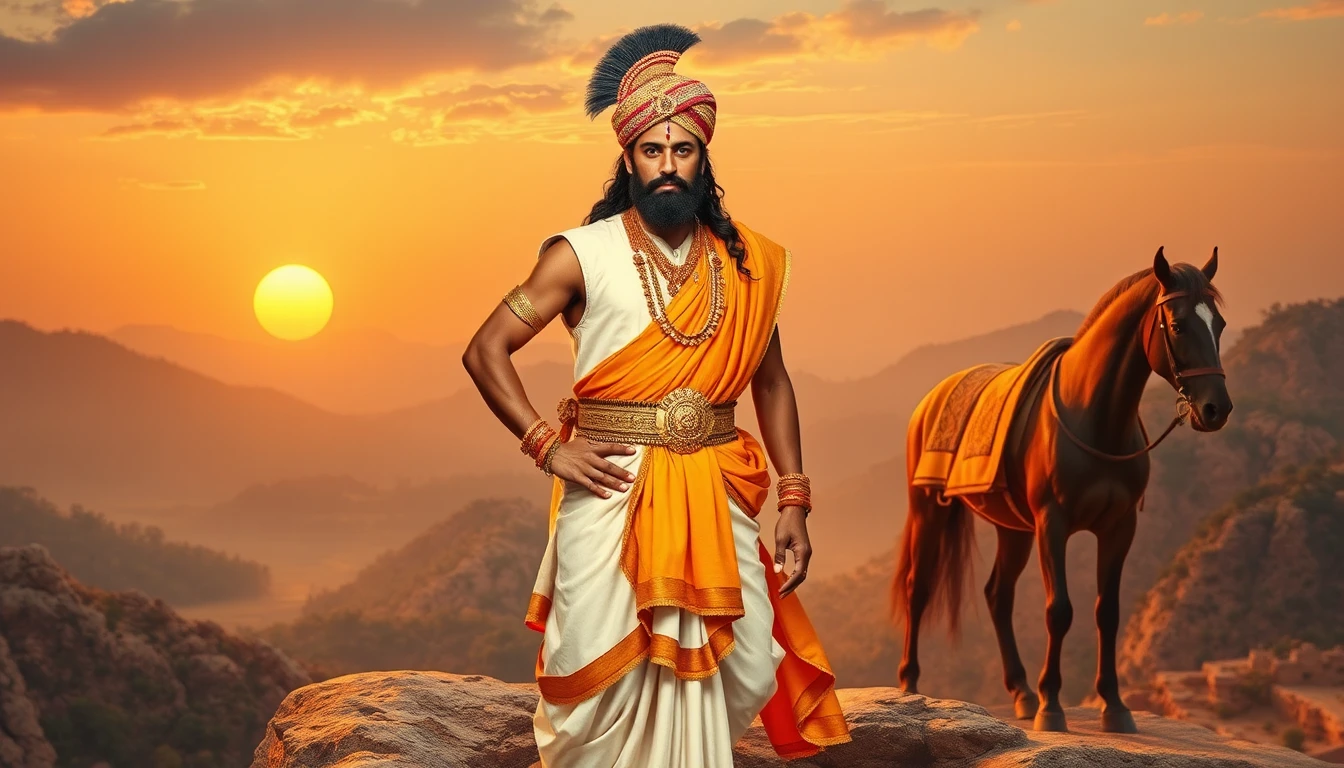 "Create an image of Maharana Pratap, the legendary king of Mewar, standing proudly on a rocky outcrop overlooking the Aravalli hills. -- Pratap stands 7 feet 5 inches tall, wearing traditional Rajput attire: - A regal white and saffron-colored dhoti and kurta - A intricately designed golden belt around his waist - A majestic turban, adorned with precious gems and feathers -- His facial expression exudes courage and determination: - Strong jawline - Piercing brown eyes - Thick, well-groomed beard -- In the background: - The majestic Chetak, his loyal horse, stands by his side - The sun sets behind the hills, casting a warm orange glow - Subtle hints of the Mewar fortifications and forests
