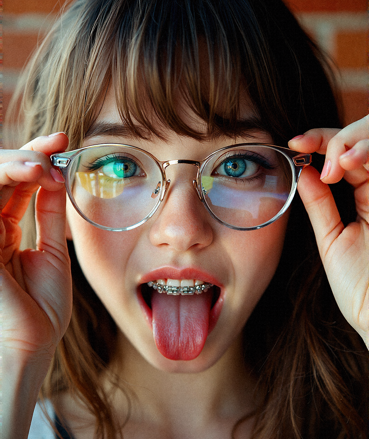 semi-realistic close-up portrait of a nerdy beauty with glasses and braces, (Both hands gently holding her glasses, as if adjusting them, with her mouth opens, tongue out). Her glasses are clear-framed, highlighting her expressive (bright aqua eyes). The reflection on the lenses captures subtle details of the surrounding environment without obscuring her gaze. (Side-Swept Bangs with Layers: Long, side-swept bangs that frame the face and blend into long layers), with a few strands catching the natural light, creating a delicate glow. The intricate braces on her teeth, with shiny metallic wires and brackets, add a youthful and relatable touch to her smile. The lighting is soft and natural, possibly from a nearby window, casting gentle highlights on her face, emphasizing the texture of her skin, the smoothness of her lips, and the sparkle in her eyes. Her lips have a natural pink tint, and her eyebrows are neatly shaped, adding definition to her face. The background is softly blurred with a warm-toned brick wall, ensuring that all attention is on her facial features. Focus on capturing every detail with precision—from the shine on her braces to the tiny reflections in her eyes, down to the texture of her skin. The image should evoke a sense of warmth, authenticity, and casual charm, with a high level of realism that makes the viewer feel as if they are standing right in front of her.
