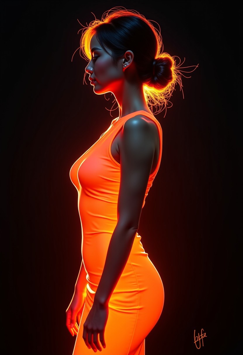 This striking artwork features a stylized portrait of a Asian woman bathed in vibrant neon hues, blending elements of elegance with a futuristic aesthetic. The woman stands in profile, her feminine shapely yet curvy figure accentuated by a sleek, form-fitting dress that radiates in a brilliant orange, contrasting sharply with the cool gray tones of her skin. The dress drapes smoothly along her body, catching the light in a way that emphasizes its texture and the graceful curve of her silhouette. The lighting is bold and dramatic, with intense highlights and shadows that create a sense of depth and intrigue. Her hair is styled in a loose updo, with tendrils softly framing her face and catching the vivid light, creating an almost halo-like effect around her head. The neon glow of the orange light wraps around her form, casting delicate reflections that seem to blend seamlessly into the deep black background, making her appear both ethereal and grounded. The contrast between the warm glow of the orange and the coolness of the gray gives the piece a dual-toned, cinematic quality, reminiscent of cyberpunk art styles. <lora:flux_bra2ha_noirV2_bnr:0.8> BNR style highlights.