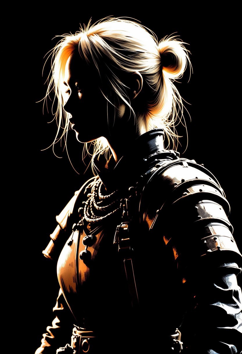 Silhouette Art, magnificent, dark background, portrait of stunning oriental woman, messy blonde bob, bronze plate armour,, light hitting one side of face, inksketch