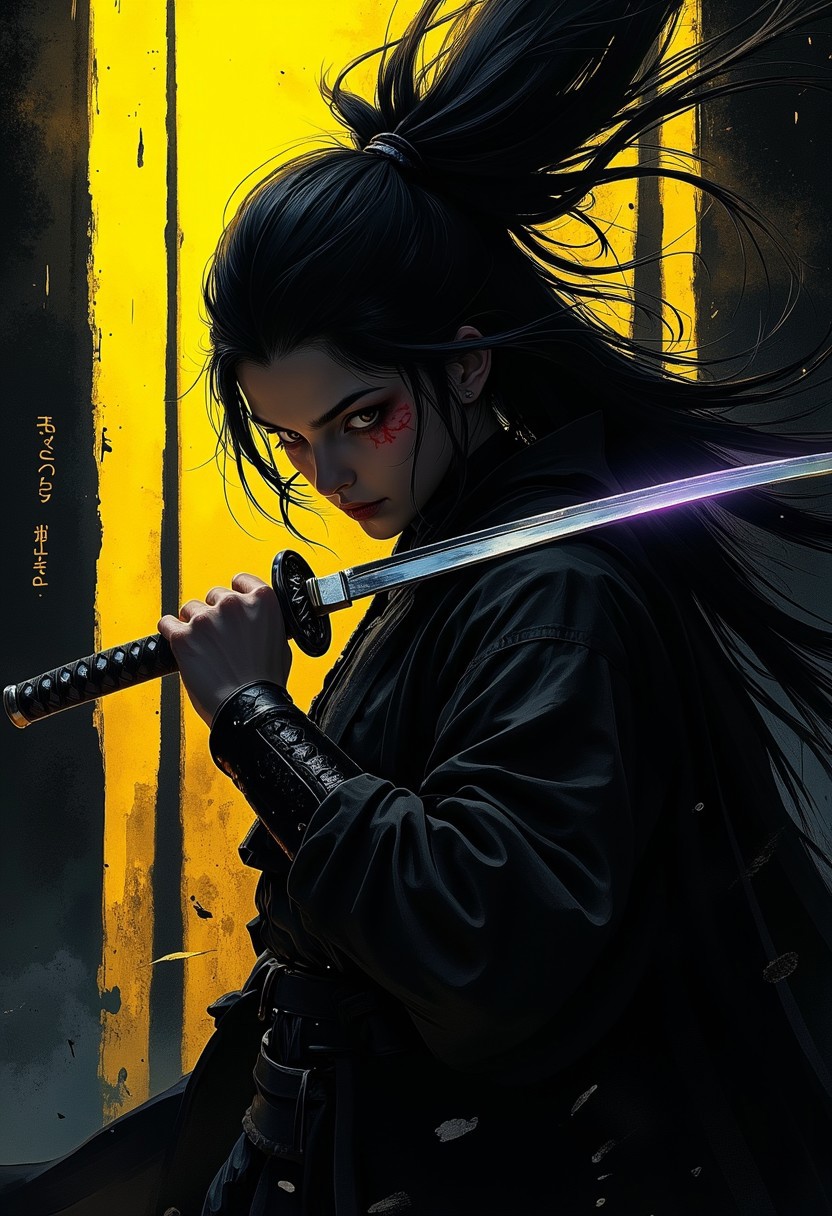 A close-up digital artwork in anime style featuring a lone female ninja with long, flowing hair that cascades around her like dark, stormy waves. She stands in a fierce combat stance, holding her katana horizontally in front of her face. The blade gleams with a faint, 80s-inspired DARK yellow/purple glow, its sharp edge catching the dim, worn-out light around her. Her intense eyes, framed by the deep black of her hair and armor, lock onto her unseen opponent with an unwavering, piercing gaze. The katana reflects the surrounding glow, creating angular highlights, while the rest of the image is consumed by shadowy blackness. Behind her, abstract, geometric lines run vertically, like cosmic energy pulsing through a swirling, textured background of deep yellow and blacks—evoking the vastness of space. The cosmic aura surrounds her, as if she’s standing on the edge of another dimension, poised for a battle that transcends time and space. The swirling nebula dust and rough textures add depth and mystery, blending extreme minimalism with an otherworldly aesthetic. Her flowing hair, combined with the ethereal glow of her katana, captures the tension and power of the moment, making her presence both commanding and cool in this dark, atmospheric scene.