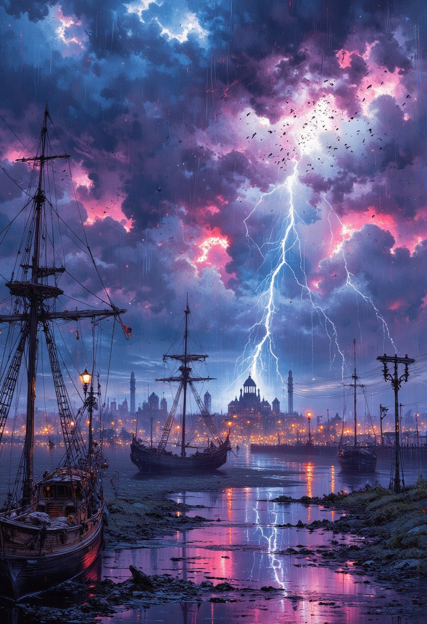 mythp0rt, ArsMJStyle, impressionism, smooth and sharp, ultra realistic ominous and dark, deep shadows , over the small port town, small river nearby, docks with wooden ships, busy skies before the storm, clouds are dense and huge, wires and pipes on the ground, bright red lines in the sky, dense clouds with red lines, blue sand ground, whole picture is filled with crows and raindrops, white lines in the sky, purple and blue and white desert scene, desolate, intricate and detailed, trending on artstation.