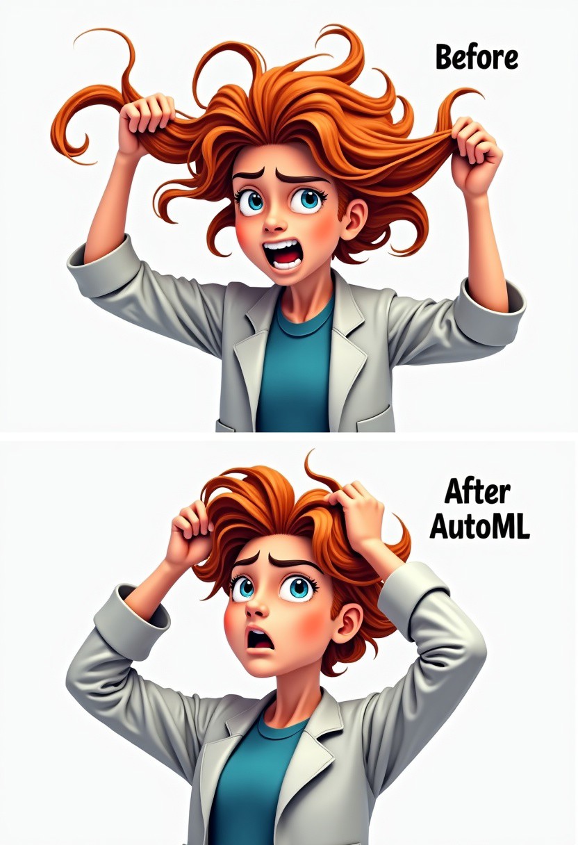 A fun, image meme "before and after" meme illustrating a data scientist pulling their hair out and very stressed and angry and a text "before AutoML", the other part where we see text: "after AutoML" showing a relaxed version and happy version of the same scientist after AutoML.