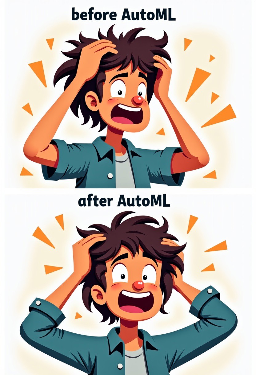 A fun, image meme "before and after" meme illustrating a data scientist pulling their hair out and very stressed and angry and a text "before AutoML", the other part where we see text: "after AutoML" showing a relaxed version and happy version of the same scientist after AutoML.