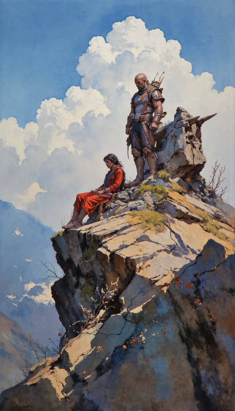 GLOW,intricate tetradic colors in every details,watercolor painting,FLUORESCENT,Rhizocarpon geographicum texture,gold dust, A swashbuckling duo, atop a precipitous crag, surveys a vista of cerulean-hued, sun-drenched mountains. Their forms, limned in the golden hour's oblique illumination, hint at narratives of valor and camaraderie. The woman, resplendent in crimson, clutches a gleaming blade; her companion, a figure of sartorial elegance in beige, bears a quiver and bow. Their gazes, fixed upon the ineffable grandeur of the panorama, convey a sense of dauntless determination. The scene, rendered in a painterly impasto, pulsates with an ethereal, otherworldly aura. Focus on the interplay of light and shadow, the tangible texture of rock and fabric, and the subtle emotional resonance of the figures' postures. Augment the scene with a palpable sense of wind, hinting at the challenges that lie ahead.