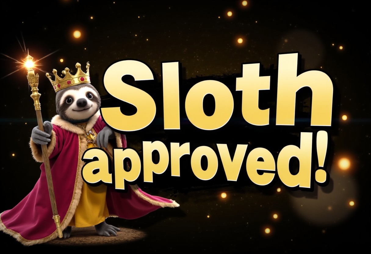 The image is a stunning national geographics Photo featuring a cute sloth king wearing a robe and holding a magic staff. In front of the text "Sloth approved!" which is prominently displayed in bold, stylized letters.