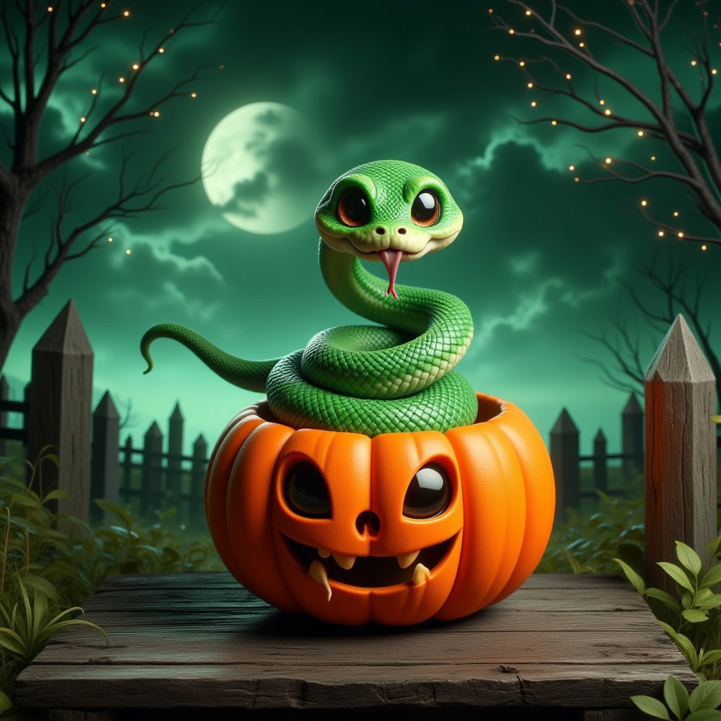 The image is a mix of cute and scary, with a cute smol emerald green snake coiled inside an evil orange jack-o'-lantern on an old wooden porch of a haunted house. The snake's head is rising out of the top of the jack-o'-lantern and has long with fangs dripping venom with a sly grin on its face. The snake's forked tongue is sticking out the side of its mouthn. The snake has no hands or arms and no horns. Hyper-detailed 8K resolution capturing fine scale details. In the far distance is a greenish crescent moon and stars with dark ominous clouds, pinkchibihalloween,