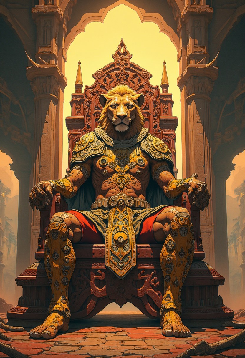 The lion king sits on an intricately carved throne in the massive tribal throne room, he wears ornate, golden armour with intricate tribal patterns, golden light, with hints of crimson and amber, dramatic scenery, elephant tusks decorate the walls, arches open up to the outside, reminiscent of the styles of Simon Stalenhag, Loish, and Ash Thorp, blending traditional African aesthetics with futuristic, sci-fi elements, featuring carved, worn furniture and abandoned relics, with a sense of post-apocalyptic grandeur, cyberpunk, insane detail