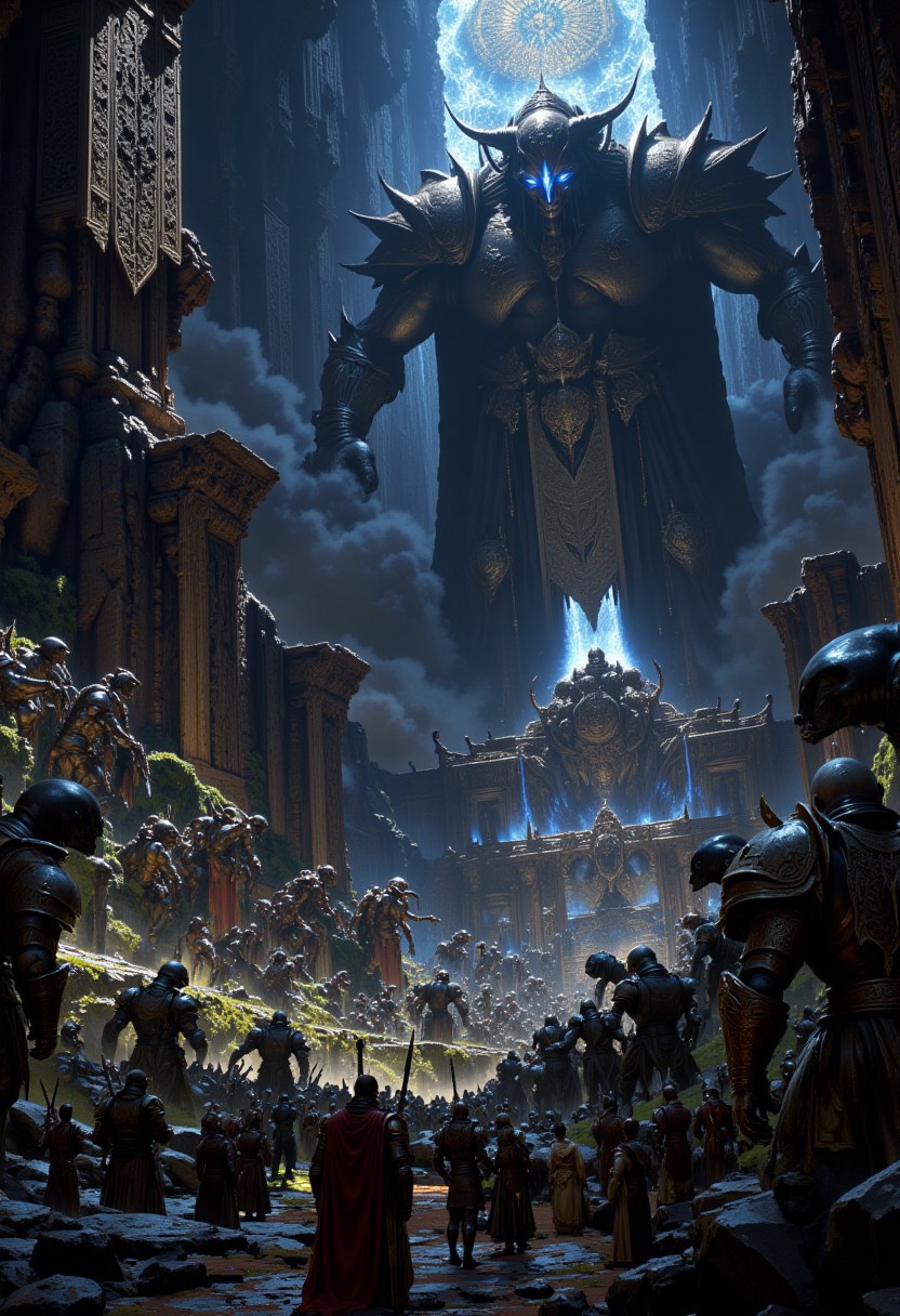 The Necropolis of Nagashizzar Unveiled: Envision a sweeping, low-angle shot capturing the monumental gates of Nagashizzar towering in the distance, shrouded in unholy mist. In the foreground, a small party of adventurers, backed against a precipice, watch in horror as skeletal sentinels rise from the cursed ground, their armor encrusted with centuries of decay. Each skeletal soldier wields massive, rusted weapons, their eyeless sockets glowing with an eerie blue light. The atmosphere crackles with power as the looming figure of a towering Lich Priest chants blasphemous incantations from atop a dais of skulls.drkfnts style