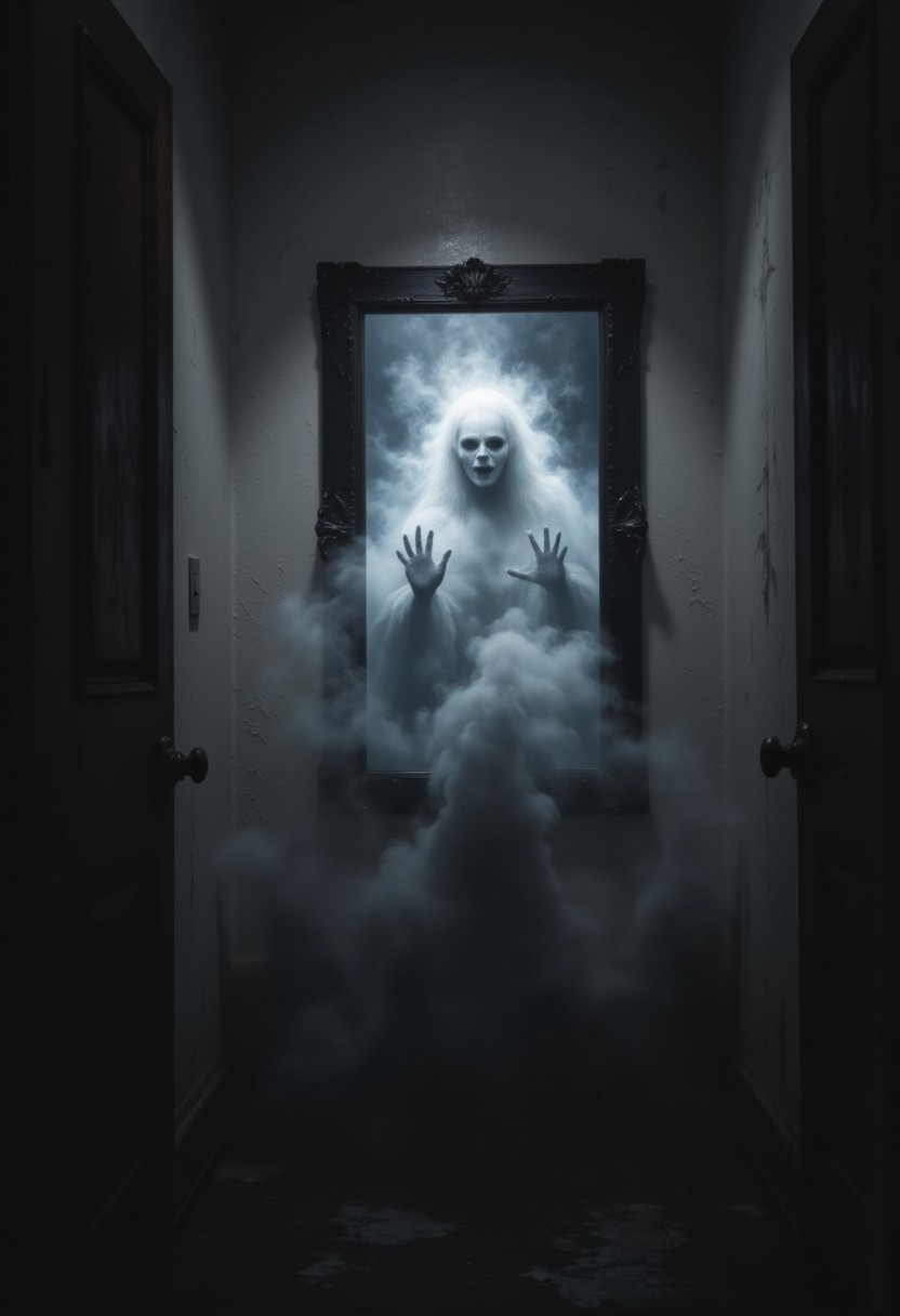 A ghostly apparition emerging from a mirror, its form swirling like mist, reaching out into the room. , aidmaHalloweenBoost, aidmaHyperrealism, aidmaimageupgrader, aidmaabdhr, aidmafluxpro1.1