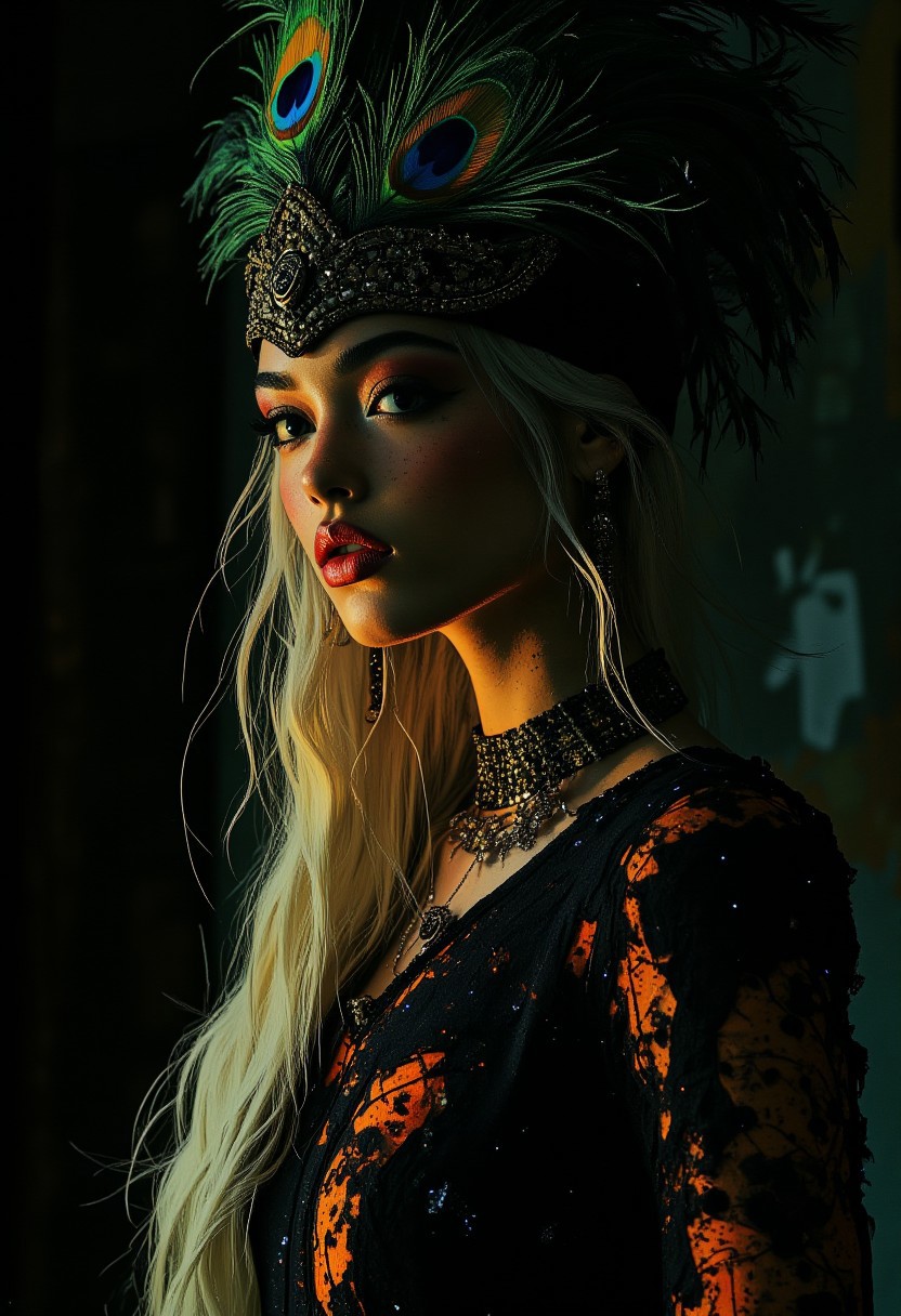 midjourney_whisper_avant_couture, japanese supermodel, long platinum hair, dark eyeshadow, red lips, wearing a masquerade costume, with a hat fashioned out of peacock feathers, and a feathered dress, dark background, silhouetted, chiascuro