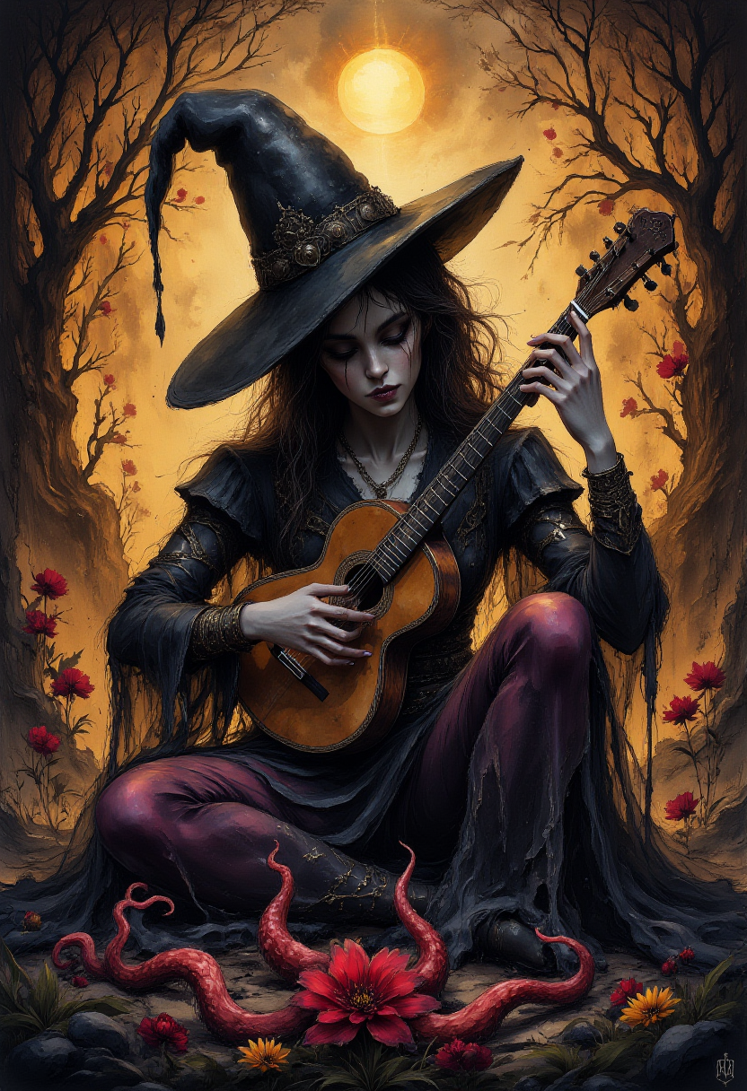 The image depicts an intricate, detailed, and spooky Halloween-themed background with a deep focus. The scene features an exhausted bard, playing his lute in front of a divine, gorgeous, and reflecting light-infused backdrop. The Epic background is sketched with high detail and displays a cinematic stillness, incorporating elements like an octopus with flowers, all blending seamlessly. The use of deep focus creates a stunning visual effect that draws the viewer's attention to the bard, who appears cute yet evil. The composition is reminiscent of the works of Al Feldstein, with an overall atmospheric and haunting mood. The image showcases a variety of artistic techniques, including deep focus, cinematic stills, and hyper-sketching, making it visually striking and memorable. ,<lora:we_fairy_flux.safetensors:0.6> ,<lora:ZenInkWashSumi-eFlux.safetensors:1.0>
