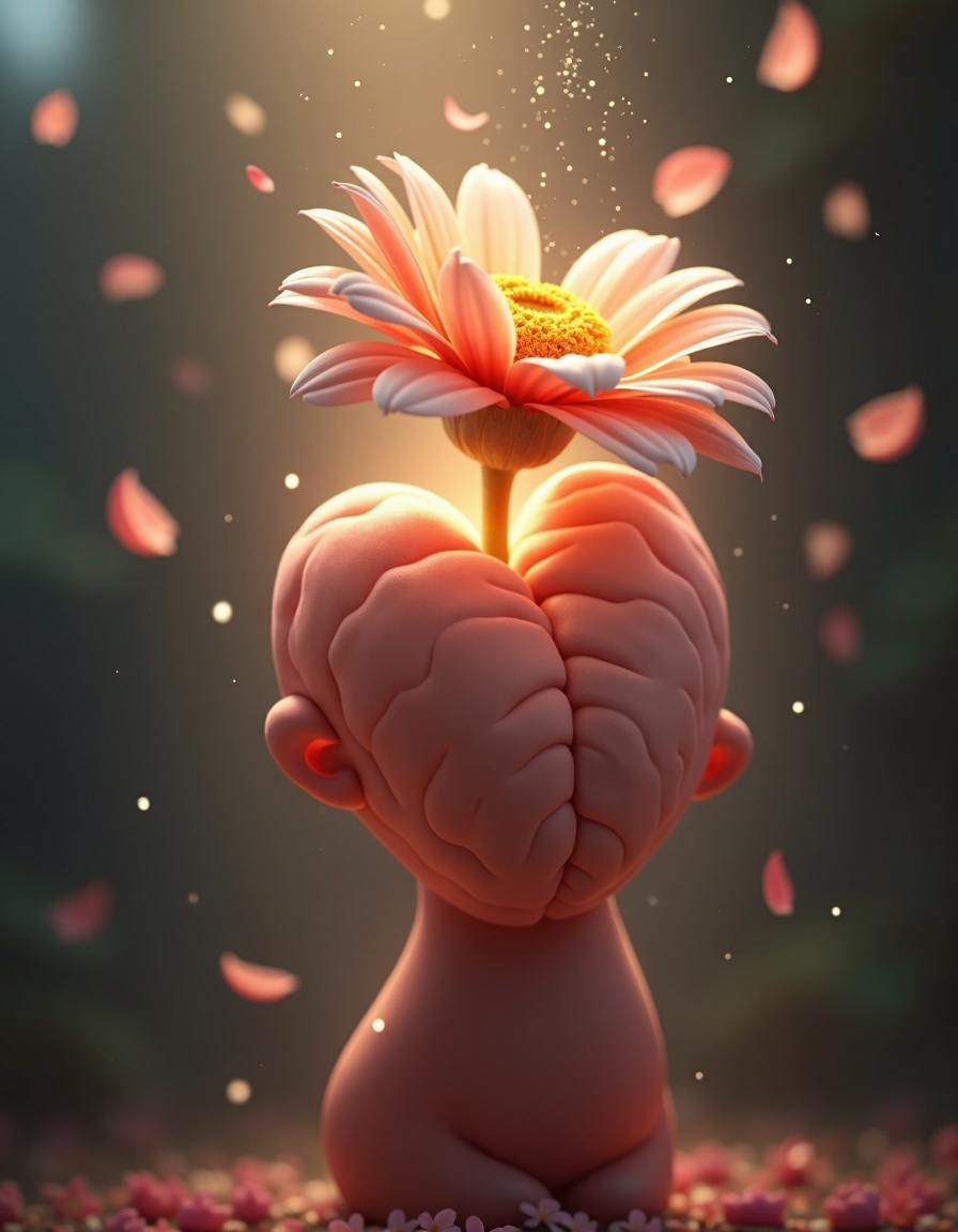 A serene and harmonious composition depicting a flower blooming from the heart of a human figure, The flower's petals slowly fall as digital rain, representing the scattering of good wishes and memories, Use Blender's Cycles engine for realistic subsurface scattering (RSS) and ray-tracing to capture the intricate details and inner glow of the flower and heart, Capture the scene using a Nikon D850 with a 24-70mm f/2,8 lens for sharp focus and clarity, Apply post-processing with Adobe Lightroom, emphasizing vibrancy and saturation while maintaining a natural look, The overall color palette should be soft, warm, and inviting â perfect for an uplifting and positive mood on Behance, , (&:0)