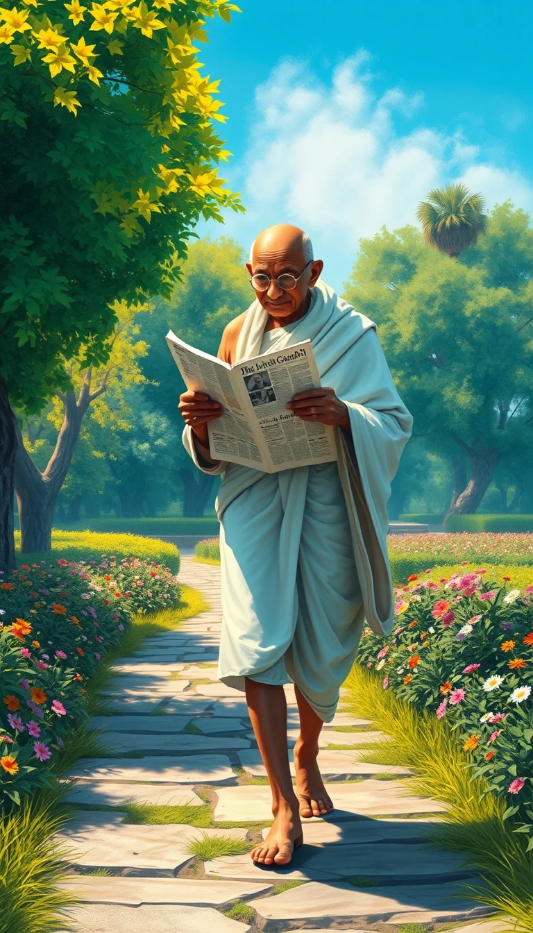 A realistic depiction of Mahatma Gandhi walking through a serene garden while reading a newspaper. He is wearing his traditional white dhoti and shawl, with round glasses perched on his nose. The garden is lush and peaceful, with vibrant green trees, colorful flowers, and a clear blue sky. Gandhi is focused on the newspaper as he strolls along a stone path, surrounded by nature, in a calm and contemplative mood." }