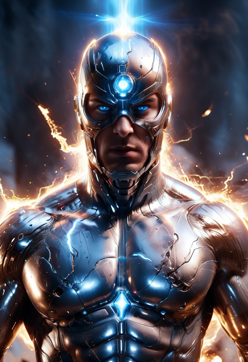 score_9, score_8_up, score_7_up, score_6_up, score_5_up, score_4_up, (absurdres, best quality, masterpiece:1.4), illustration, photorealistic, cinematic lighting, dynamic angle, perfect composition, light, light warrior, metallic bodysuit, radiant skin, muscle, battle-ready, holy energy, bright aura, sacred battlefield, heroic stance, face showing, neon blue eyes, explosion background