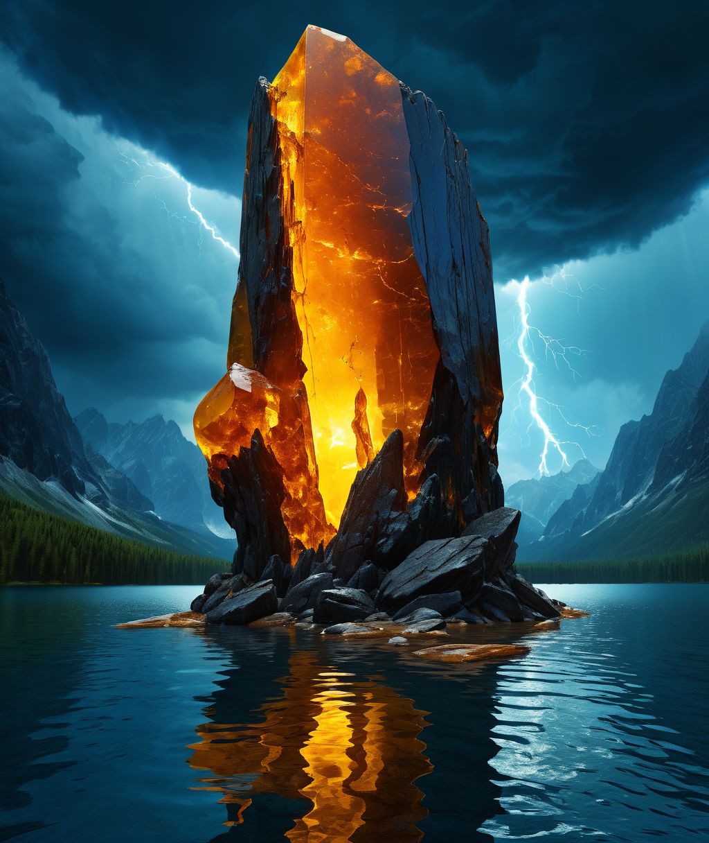 extreme resolution, highly detailed huge irregularly shaped amber monolith floats above a serene lake glowing with blue power, a storm rages behind it, enigmatic and mysterious, <lora:detailed_notrigger:1>